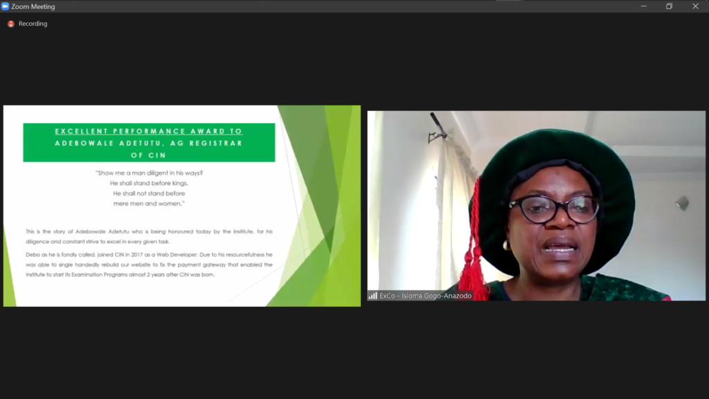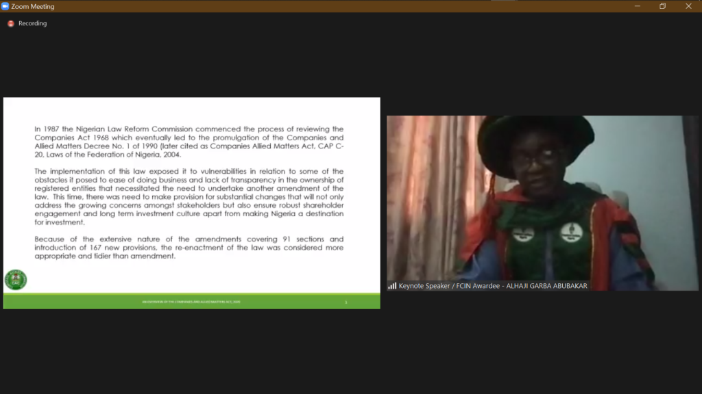 The Institute held its first-ever virtual induction ceremony. This event held online via zoom with the Registrar General, Corporate Affairs Commission, Alhaji Garba Abubakar as keynote Speaker sharing from his wealth of knowledge the ‘‘Overview of the Companies and Allied Matters act 2020’’.